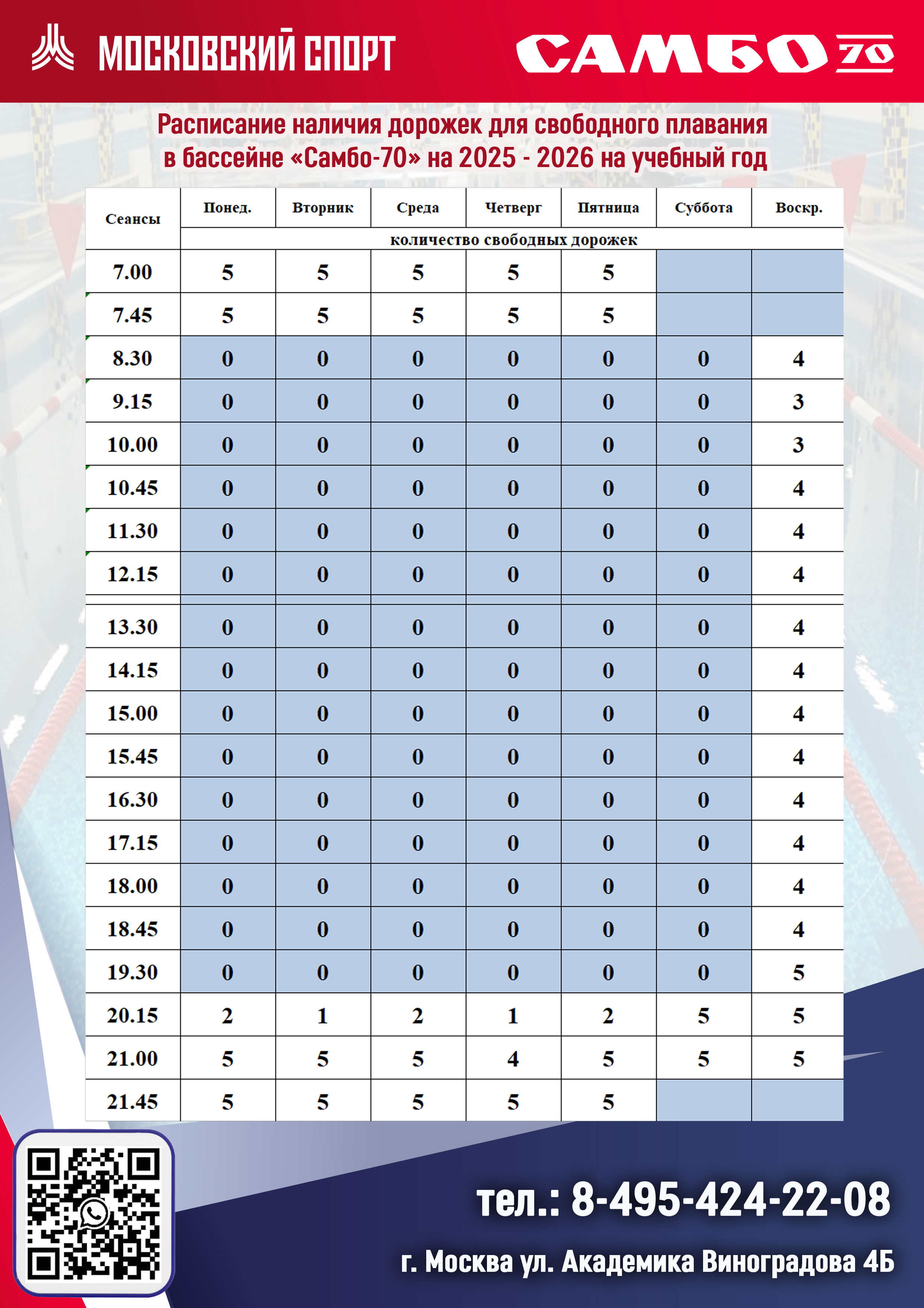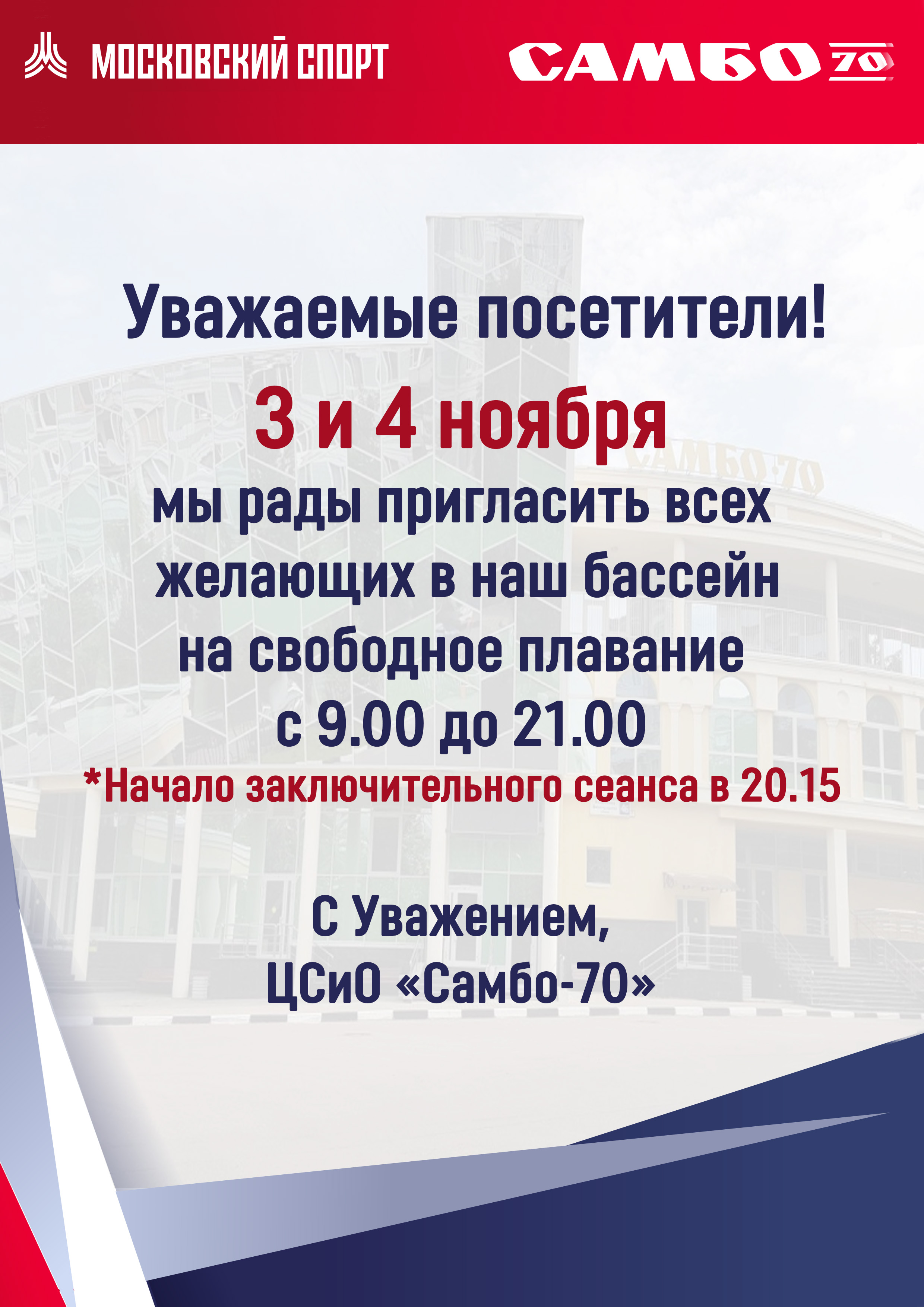 Справки по телефону: (495) 424-22-08Время работы БАССЕЙНА отделения "Самбо-70"